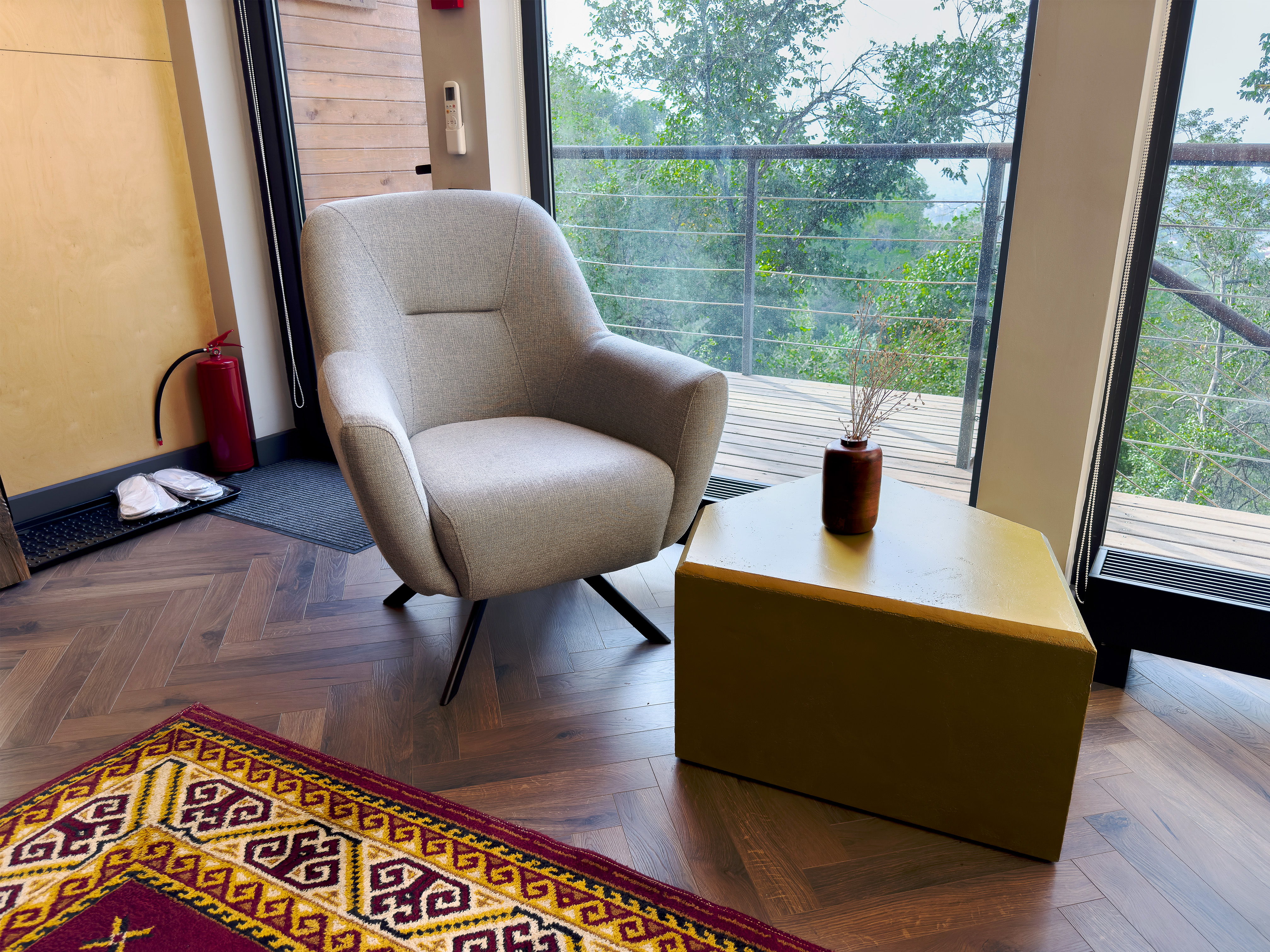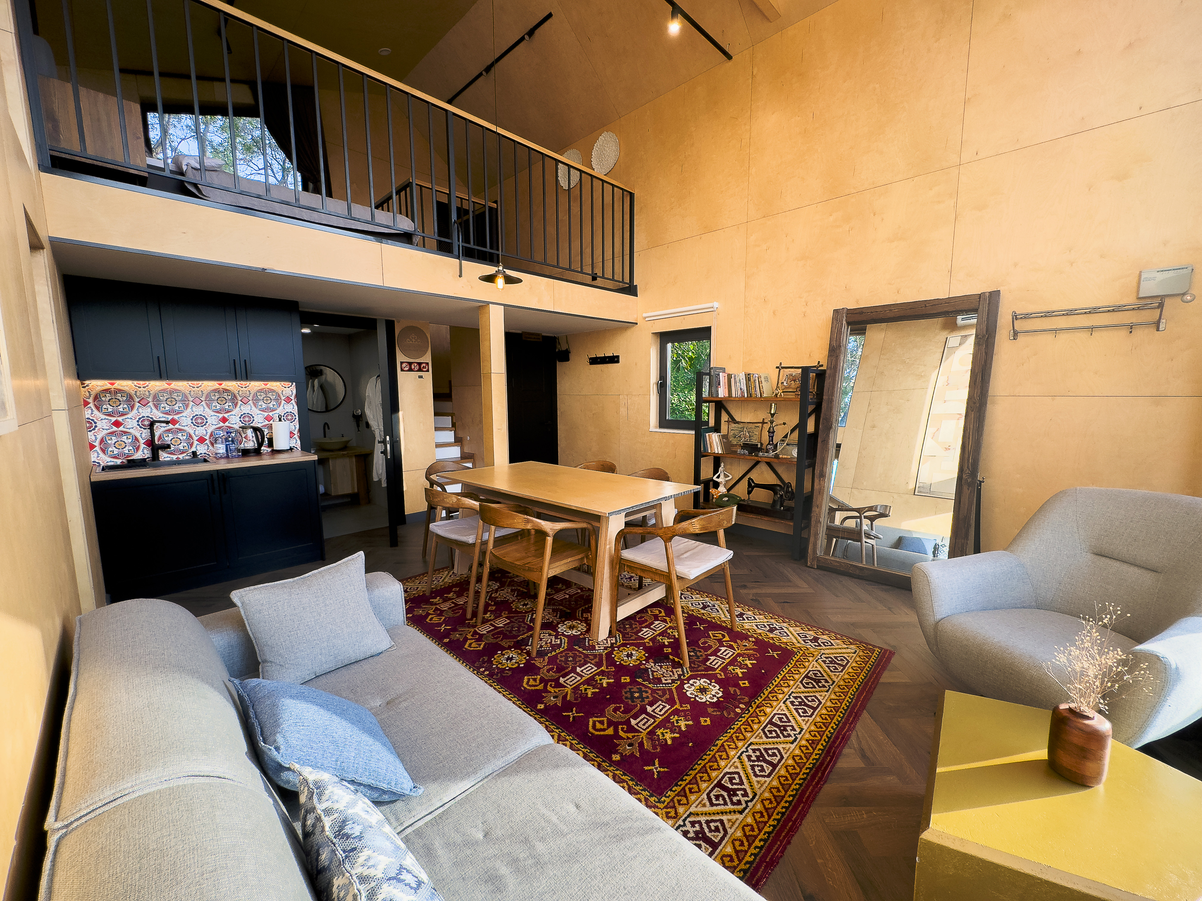 «Барнхаус» — самый просторный и впечатляющий домик Qazaq Garden. Высоченные потолки с открытыми балками, панорамное остекление от пола до потолка, натуральное дерево и камень. Полноценная кухня, большая терраса на склоне холма с видом на весь сад и горы. До 4 гостей найдут здесь всё для идеального отдыха.