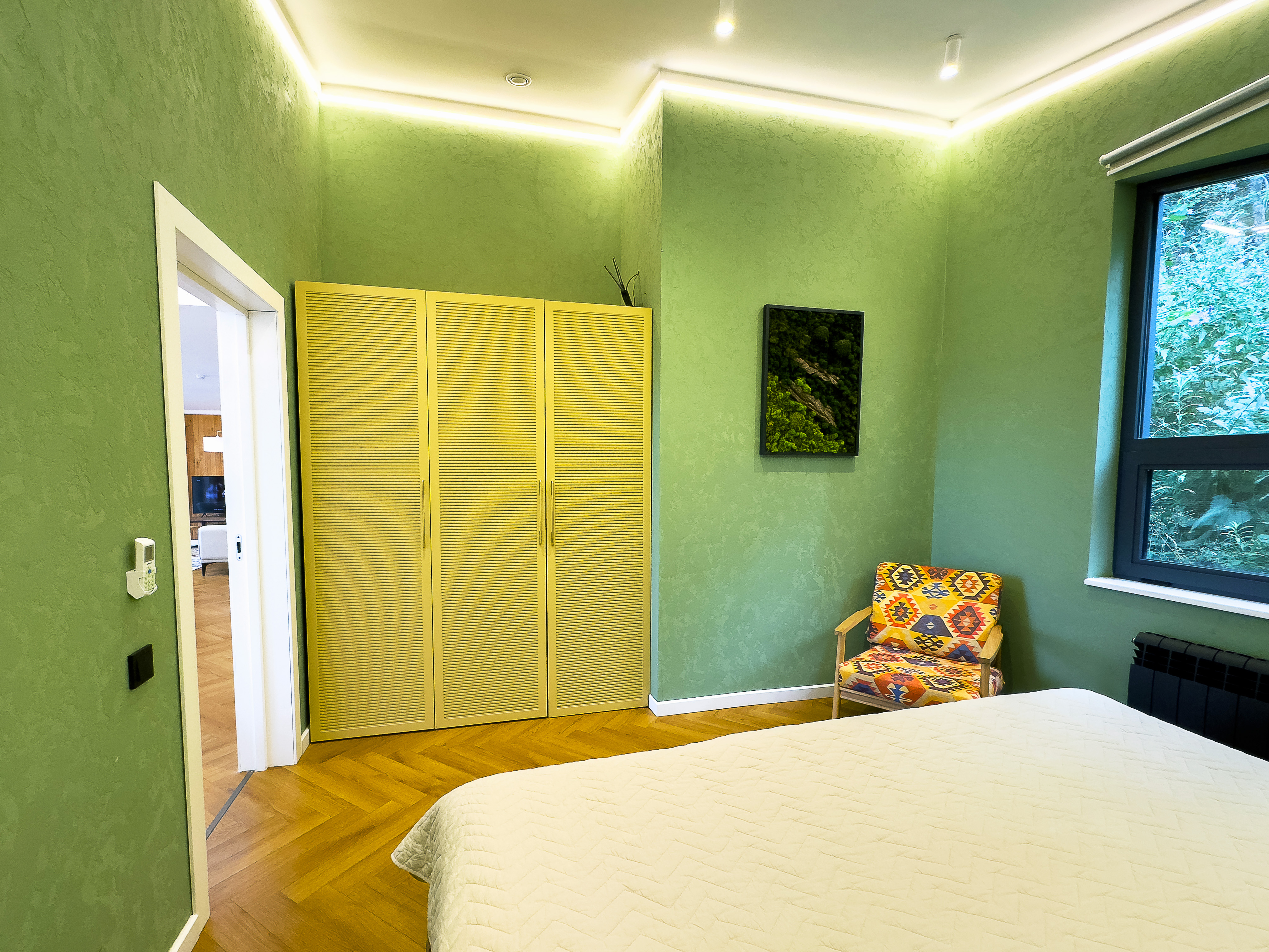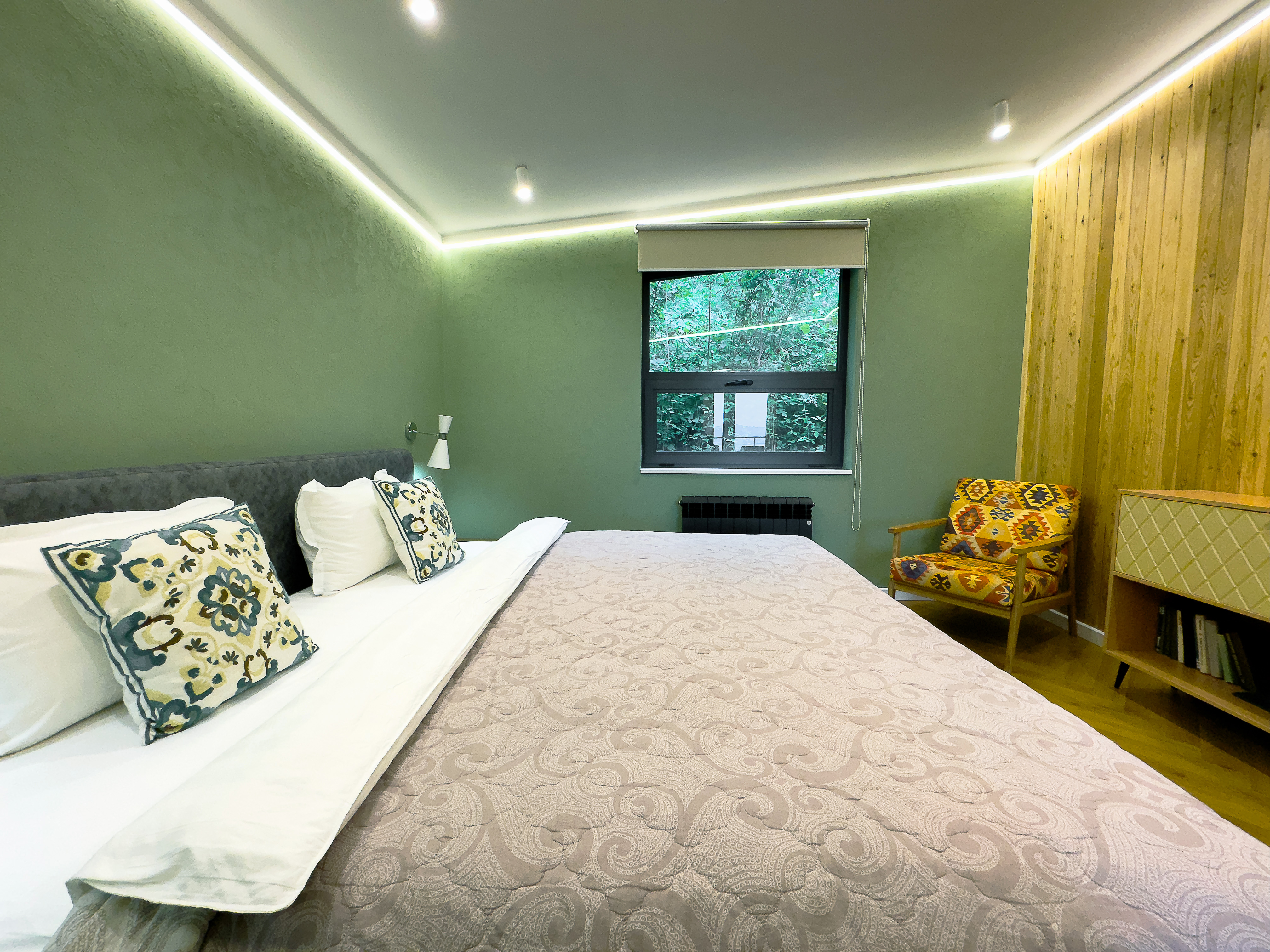 «Сканди» — воплощение скандинавского hygge в горах Казахстана. Светлые стены, натуральное дерево, большие панорамные окна с видом на долину. Просторная гостиная зона с мягкой мебелью, где хочется проводить вечера с книгой. Минимализм, который не лишает комфорта, а подчёркивает красоту окружающей природы.